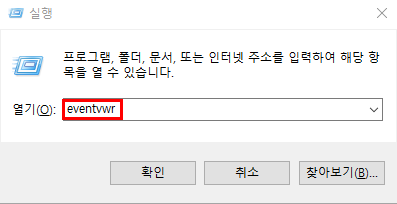 1. 실행창에서 eventvwr 를 입력 후 확인 버튼을 클릭하면