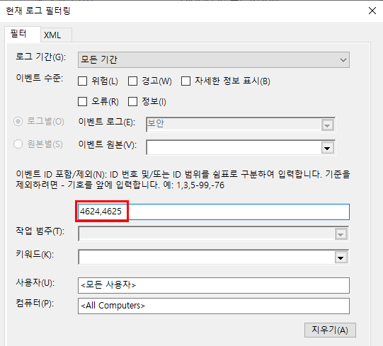 * 로그인 실패 로그만 보고 싶은 경우에는 4625 만 입력합니다.